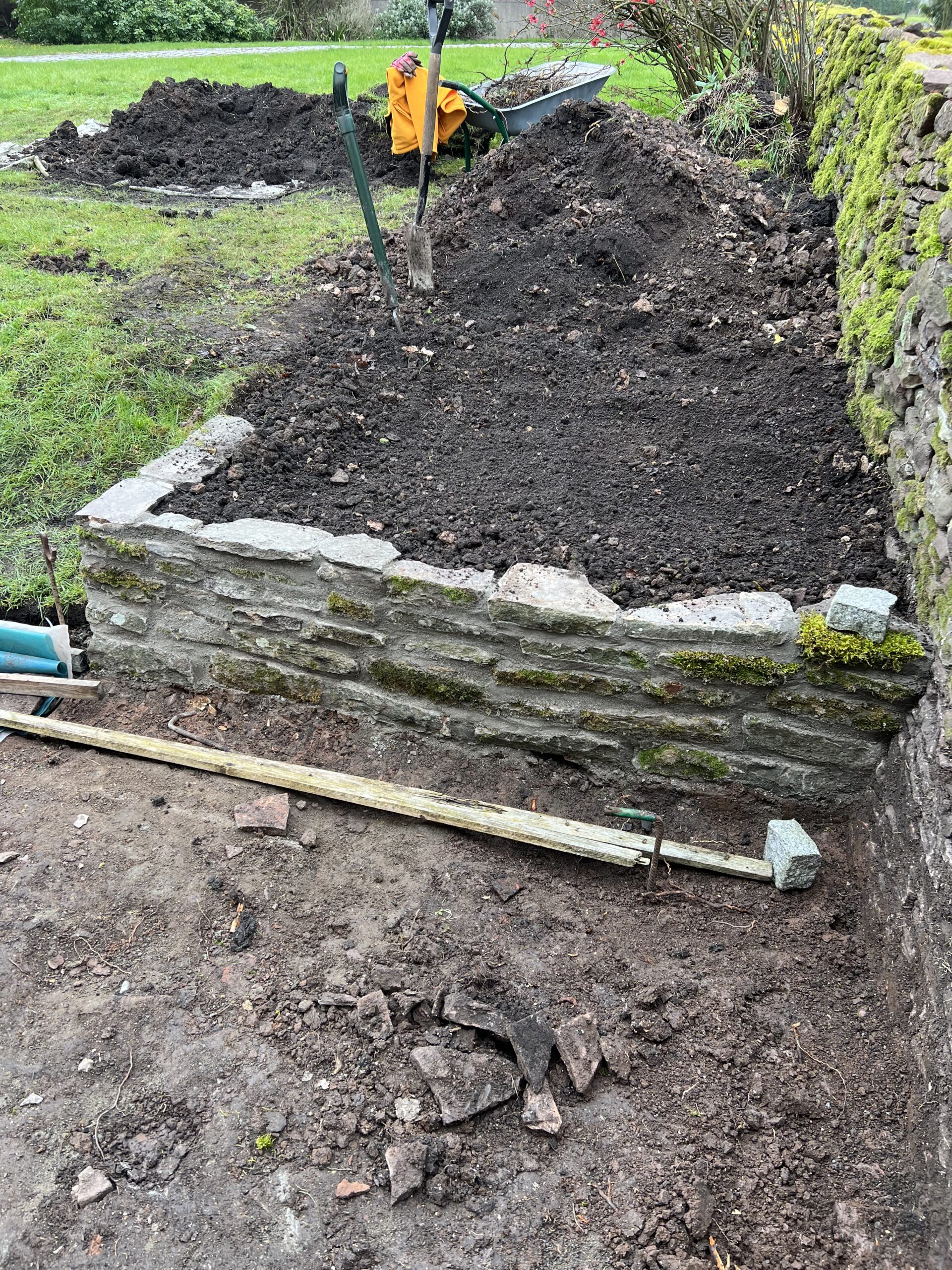 The images below show the most recent walling to make a new flower bed and extend the existing dry stone wall to fill the gap where a gate had been.